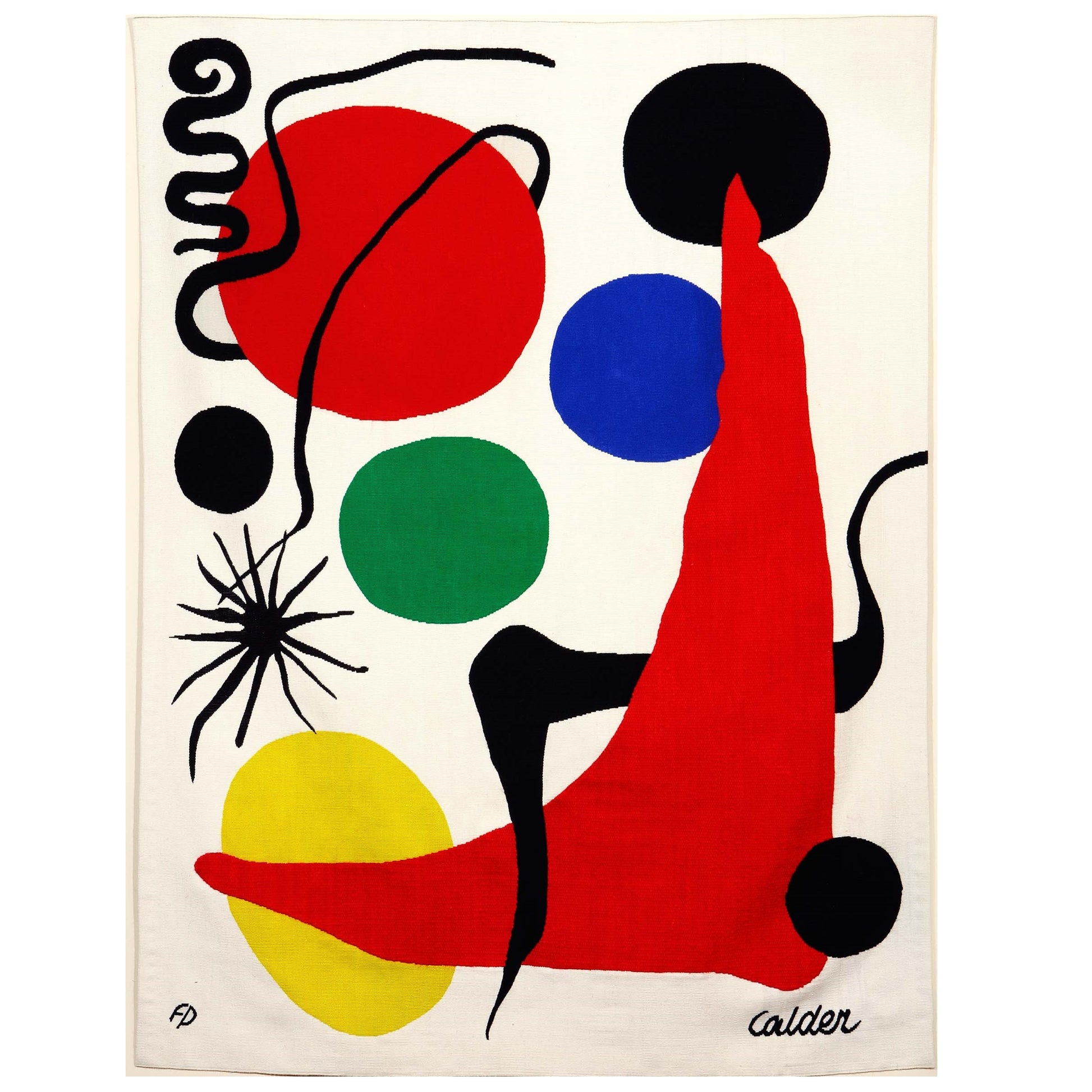 Prydnadskudde med avtagbart mönstrat fodral. Mönstren i denna kollektion är inspirerade av Alexander Calders målning "Green ball" från 1971 (se bild). Klara färger på naturvit botten. Från penseldrag till pixel.